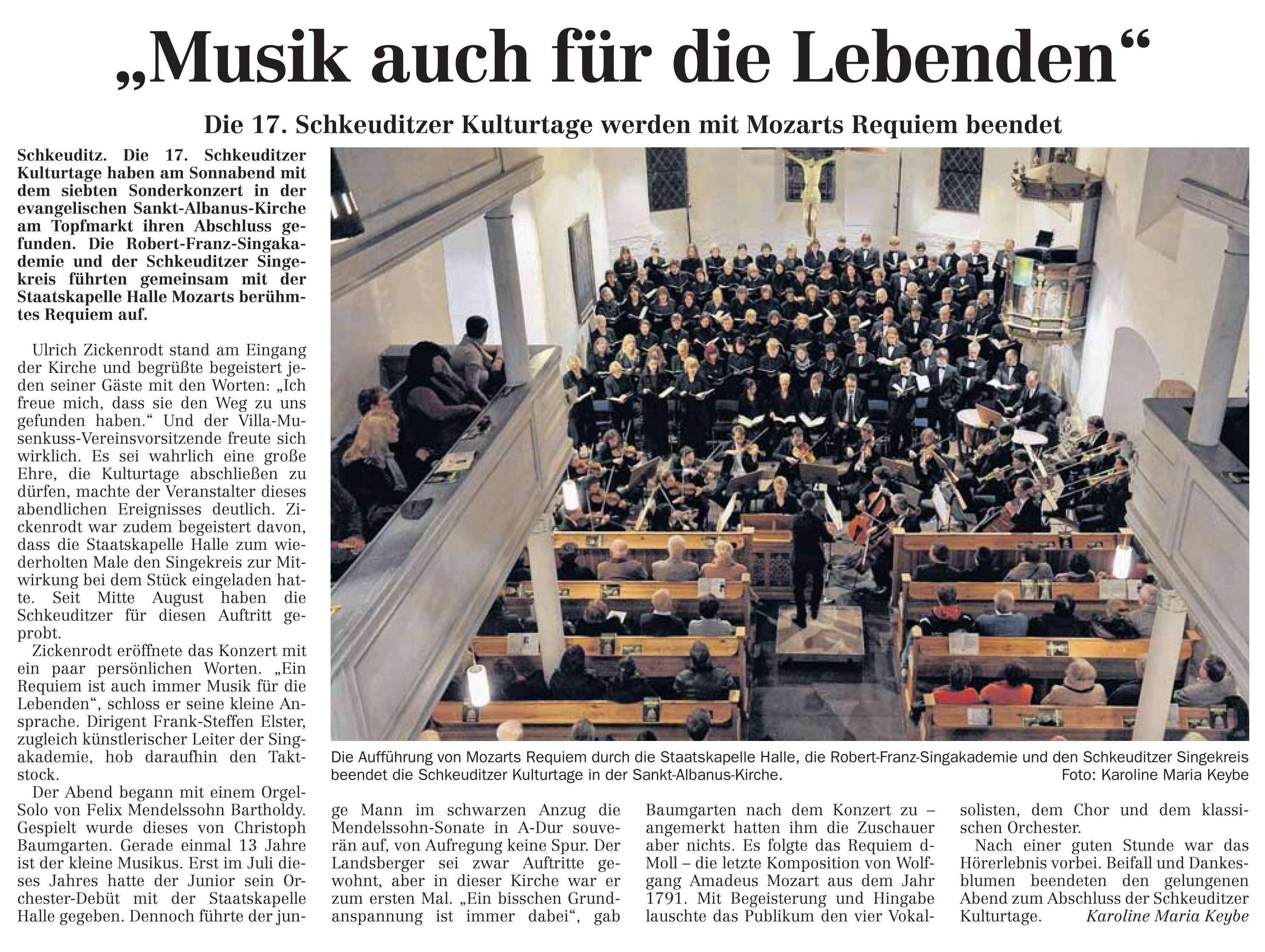 LVZ vom 25.11.2013 – Ausklang der 17. Schkeuditzer Kulturtage mit der Aufführung de Mozart-Requiems