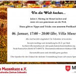 Ab 17 Uhr laden wir alle Hobbyköche herzlich in die Küche der Villa Musenkuss ein. Wer ein Rezept einmal in großer Runde kochen möchte, sollte sein Rezept bis zum Freitag vorher per Mail an kochen@villa-musenkuss.de senden. Um Anmeldung, ebenfalls bis zum Freitag vorher per Mail oder per Telefon bei der Ehrenamtskoordinatorin Frau Butenschön (0175 6089173), für die Kalkulation des Einkaufes, wird gebeten.