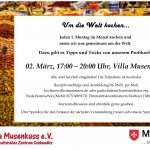 Ab 17 Uhr laden wir alle Hobbyköche herzlich in die Küche der Villa Musenkuss ein. Wer ein Rezept einmal in großer Runde kochen möchte, sollte sein Rezept bis zum Freitag vorher per Mail an kochen@villa-musenkuss.de senden. Um Anmeldung, ebenfalls bis zum Freitag vorher per Mail oder per Telefon bei der Ehrenamtskoordinatorin Frau Butenschön (0175 6089173), für die Kalkulation des Einkaufes, wird gebeten.